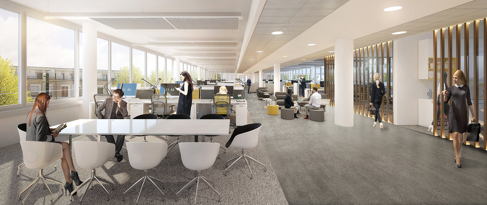 Die flexible angelegten Grundrisse bieten unterschiedliche Möglichkeiten der Raumaufteilung, so dass sowohl Einzelbüros, wie auch Großraumbüros möglich sind.