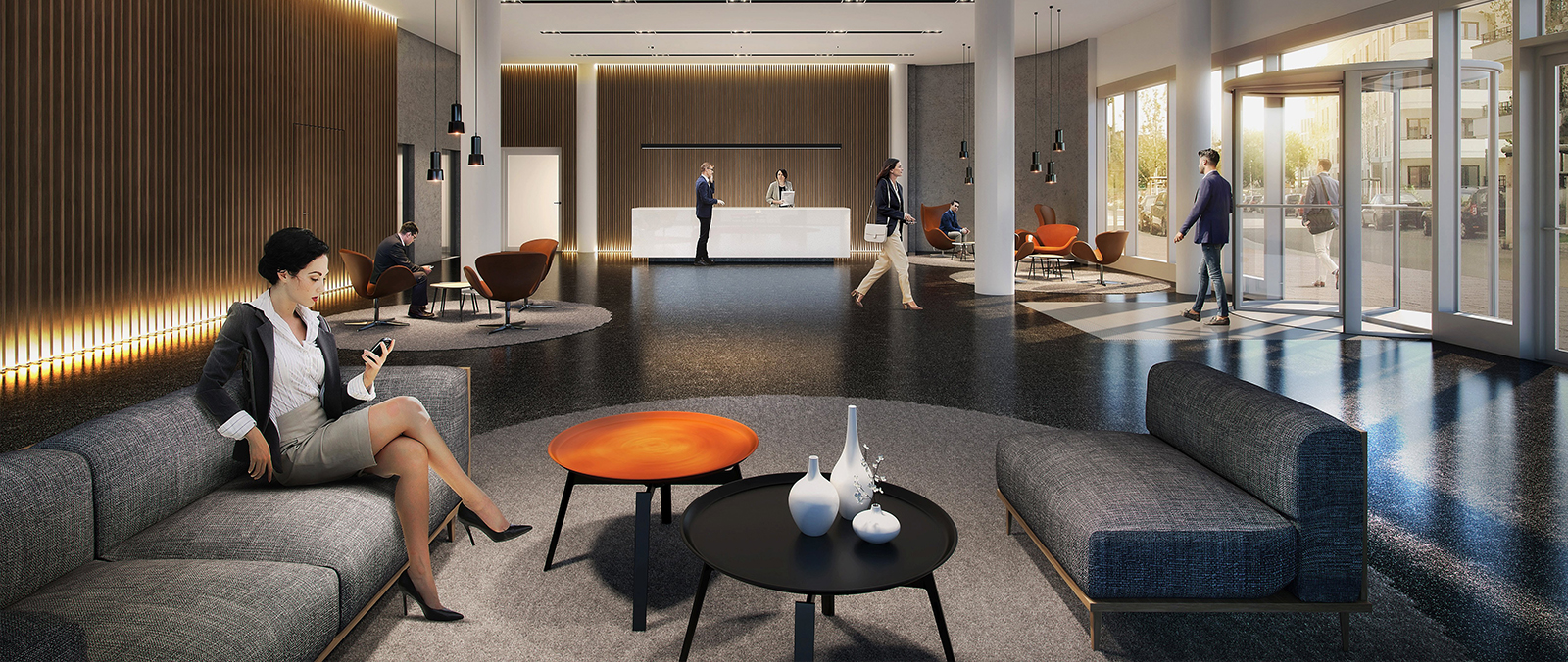 Das 6-geschossige Gebäude mit seiner hellen Klinkerfassade fügt sich mit seiner Optik und Ausstattung hervorragend in das Qualitätsniveau des hochwertigen Standorts ein.
